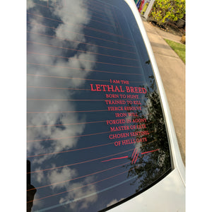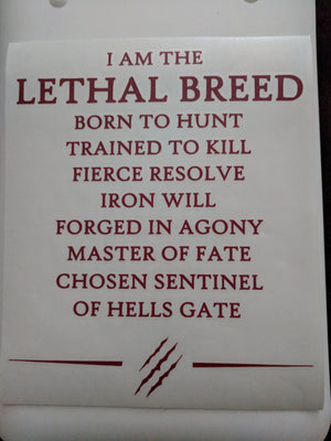 I AM THE LETHAL BREED BORN TO HUNT TRAINED TO KILL FIERCE RESOLVE IRON WILL FORGED IN AGONY MASTER OF FATE CHOSEN SENTINEL OF HELLS GATE.