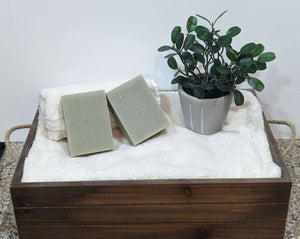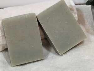 Ingredients: A saponified blend of Olive Oil, Organic Palm Oil, Organic Coconut Oil, Organic Shea Butter, Zeolite Clay, Green Clay, Eucalyptus Globulus Essential Oil, Spearmint Essential Oil, Spirulina Powder.