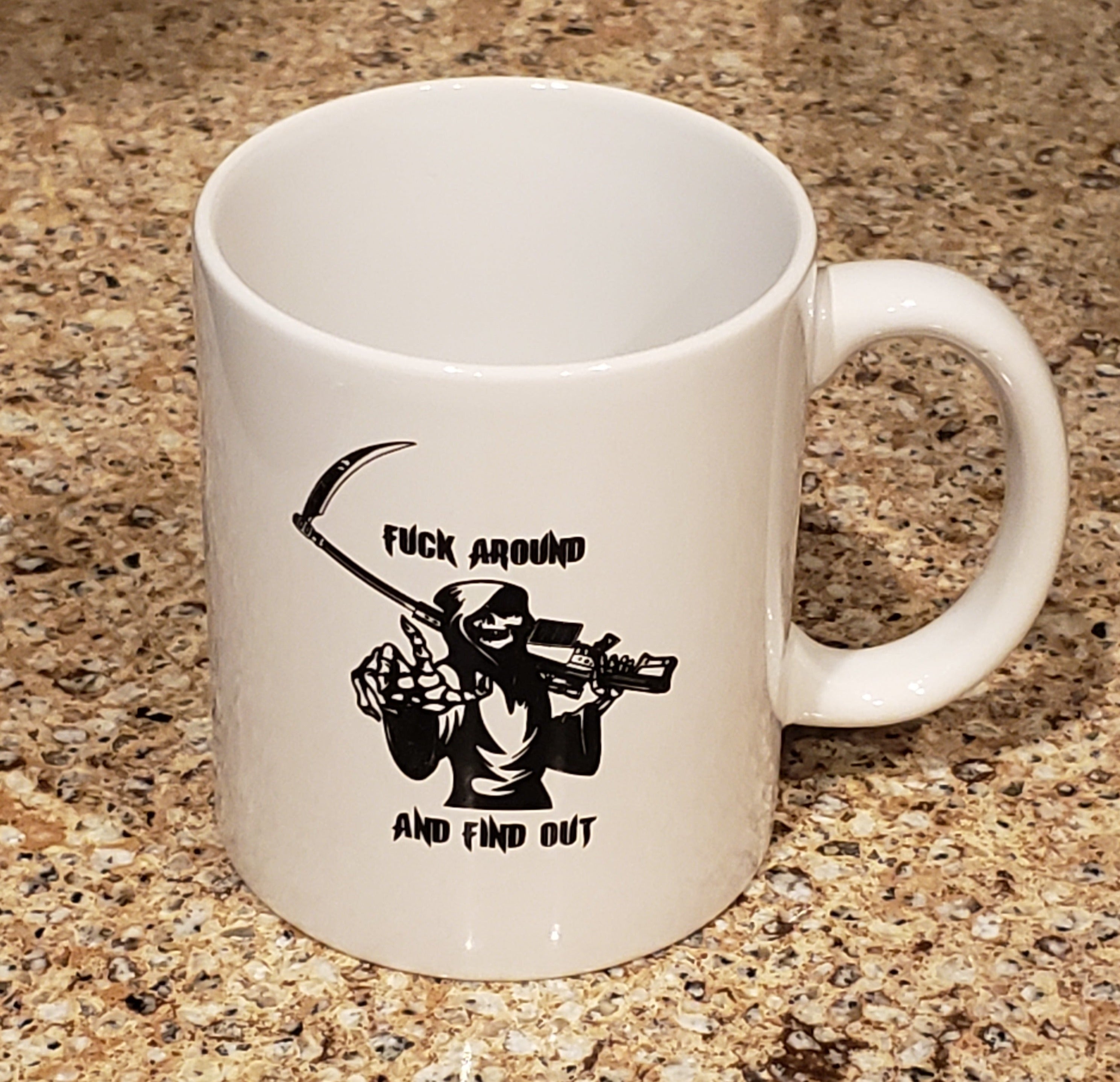 OUR CUSTOM DRAWN REAPER FUCK AROUND AND FIND OUT DESIGN IN BLACK ON A WHITE 11 OUNCE CERAMIC COFFEE MUG