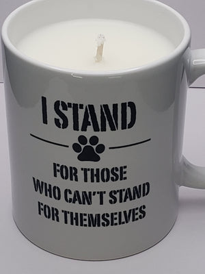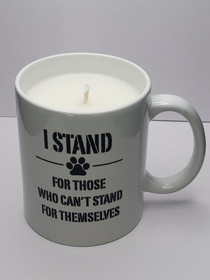 OUR 11 OUNCE CERAMIC "I STAND" RESCUE COFFEE MUG FILLED WITH YOUR CHOICE OF SCENT USING OUR PREMIUM CUSTOM SOY WAX BLEND (SUPER SMOOTH, CLEAN BURNING AND HIGH SCENT LOAD AND NEVER ANY PARAFFIN WAX)