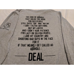I'M AN ASSHOLE. THE KIND OF ASSHOLE THAT HOLDS THE DOOR FOR OLD PEOPLE. STILL SAYS SIR OR MA'AM . I DON'T FILTER ANYTHING BUT MY COFFEE AND I DON'T HAVE PATIENCE FOR LAZY OR SELFISH PEOPLE. I LOVE MY COUNTRY AND SHOOTING PEOPLE IN THE FACE FOR IT IF THAT MEANS I GET CALLED AN ASSHOLE... DEAL